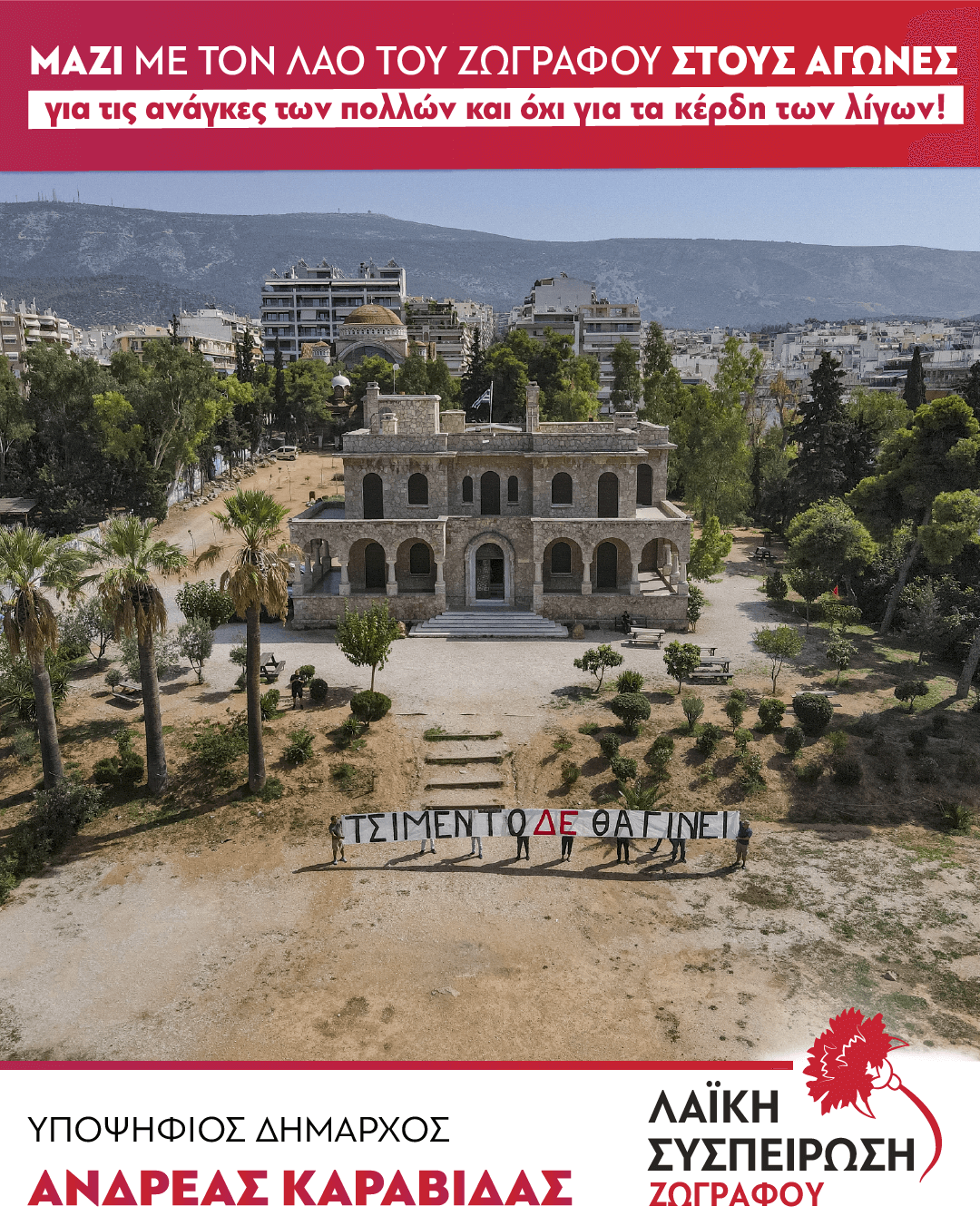 Του λέμε όπως την έφερε την μακέτα να την πάρει πίσω. Ο χώρος της Βίλας Ζωγράφου πρέπει τώρα να ενοποιηθεί και να μετατραπεί σε πάρκο υψηλού πρασίνου, ανοικτό στο λαό και στη νεολαία. Σε αυτό τον αγώνα θα μας βρει μπροστά του, όπως εδώ και δεκαετίες που μαζί με το λαό του Ζωγράφου τους χαλάμε τα σχέδια. Καλούμε όλους τους Ζωγραφιώτες και τις Ζωγραφιώτισες να διεκδικήσουν την ζωή που τους αξίζει. Να αφήσουν τον κ. Θώδα να ονειρεύεται αυτή την μακέτα όνειδος που παρουσίασε. Με τον αγώνα του να κερδίσει και αυτή τη μάχη. Στις δημοτικές εκλογές να ισχυροποιήσει την Λαϊκή Συσπείρωση, την δική του φωνή διεκδίκησης και αγώνα.
