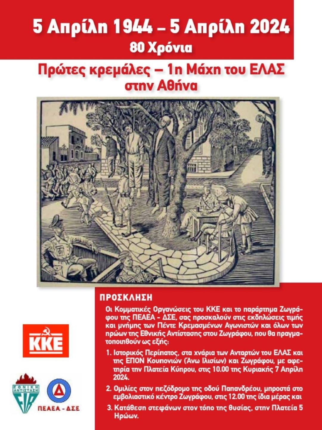 Οι Κομματικές Οργανώσεις Ζωγράφου του ΚΚΕ και το Παράρτημα Ζωγράφου της ΠΕΑΕΑ-ΔΣΕ, σας προσκαλούν στις εκδηλώσεις τιμής και μνήμης των Πέντε Κρεμασμένων Αγωνιστών και όλων των ηρώων της Εθνικής Αντίστασης στου Ζωγράφου, που θα πραγματοποιηθούν ως εξής: