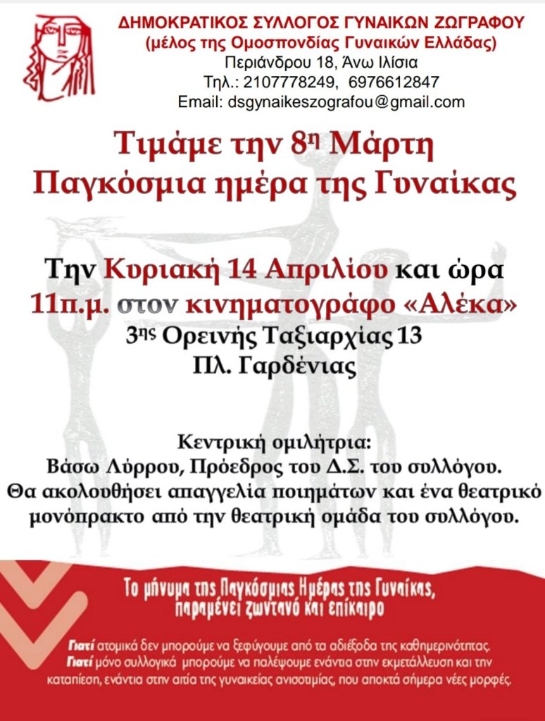 Ο Δημοκρατικός Σύλλογος Γυναικών Ζωγράφου σας καλεί
