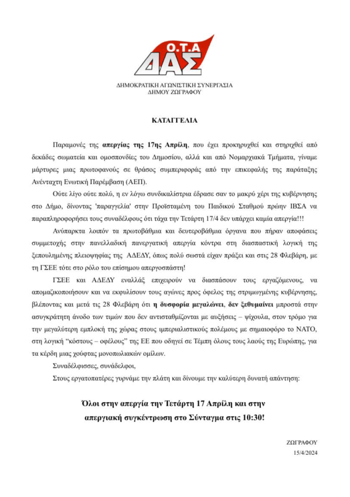 « Παραμονές της απεργίας της 17ης Απρίλη, που έχει προκηρυχθεί και στηριχθεί από δεκάδες σωματεία και ομοσπονδίες του Δημοσίου, αλλά και από Νομαρχιακά Τμήματα, γίναμε μάρτυρες μιας πρωτοφανούς σε θράσος συμπεριφοράς από την επικεφαλής της παράταξης Ανένταχτη Ενωτική Παρέμβαση (ΑΕΠ).