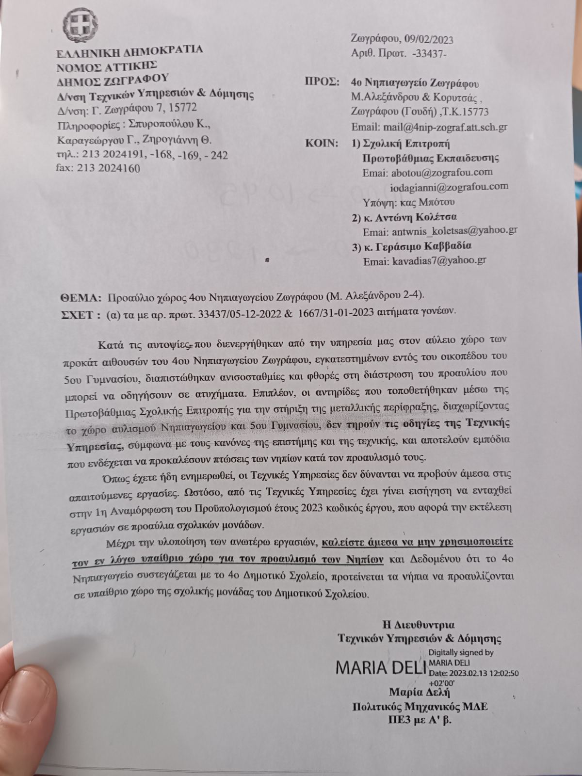 Δεν έχουμε καμία εμπιστοσύνη στην δημοτική αρχή γιατί ακριβώς υπηρετεί κεντρικές πολιτικές που υποβαθμίζουν τη παρεχόμενη εκπαίδευση των παιδιών μας. Από την πρώτη στιγμή που ανέλαβε εφάρμοσε την δίχρονη προσχολική αγωγή με «πασαλείμματα» και προσωρινές λύσεις από αυτές που κατάντησαν μόνιμες τελικά. Προσπαθεί εδώ και δυο χρόνια να μας πείσει ότι εφάρμοσε την δίχρονη ενώ παρέλαβε από τους προηγούμενους καθυστερήσεις. Είναι αλήθεια ότι και η σημερινή και η προηγούμενη και όλες ανεξαιρέτως  οι δημοτικές αρχές έχουν τεράστιες ευθύνες για την κατάσταση που υπάρχει συνολικά στην σχολική στέγη στο δήμο μας. Καινούρια σχολεία δεν κτίζονται, το τελευταίο καινούριο κτήριο έγινε πριν 15 χρόνια, καινούρια νηπιαγωγεία βαφτίζουν τις ακατάλληλες αίθουσες προκάτ στις αυλές των σχολείων και έχουν και το θράσος να κομπάζουν ότι φτιάχνουν αίθουσες. Που ακούστηκε το 2023 τα νήπια να στεγάζονται σε μεταλλικά κουτιά;;; Που ακούστηκε το 2023 η πλειοψηφία των σχολείων στου Ζωγράφου να είναι χτισμένα εδώ και δεκαετίες με τους παλιούς αντισεισμικούς κανονισμούς και κάθε καλοκαίρι να παρουσιάζουν τα στοκαρίσματα και τα βαψίματα ως συντήρηση των σχολείων, και να λένε στους γονείς των λαϊκών οικογενειών ότι πρέπει να είστε ευχαριστημένοι;;;