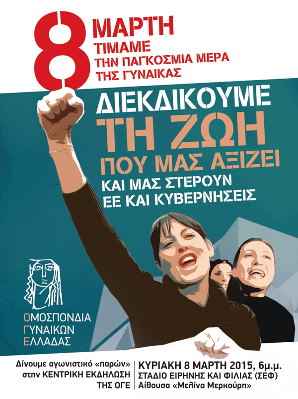 Να τιμήσουν την 8η Μάρτη, Παγκόσμια Μέρα της Γυναίκας, διεκδικώντας τη ζωή που τους αξίζει και τους στερούν ΕΕ και 8marti_SEFκυβερνήσεις, καλεί τις εργαζόμενες, τις άνεργες, τις αγρότισσες, τις αυτοαπασχολούμενες, τις μετανάστριες, τις νέες γυναίκες η ΟΓΕ. Η κεντρική εκδήλωση της ΟΓΕ θα γίνει την Κυριακή 8 Μάρτη, στις 6 μ.μ., στην αίθουσα «Μελίνα Μερκούρη», του Σταδίου Ειρήνης και Φιλίας (ΣΕΦ).