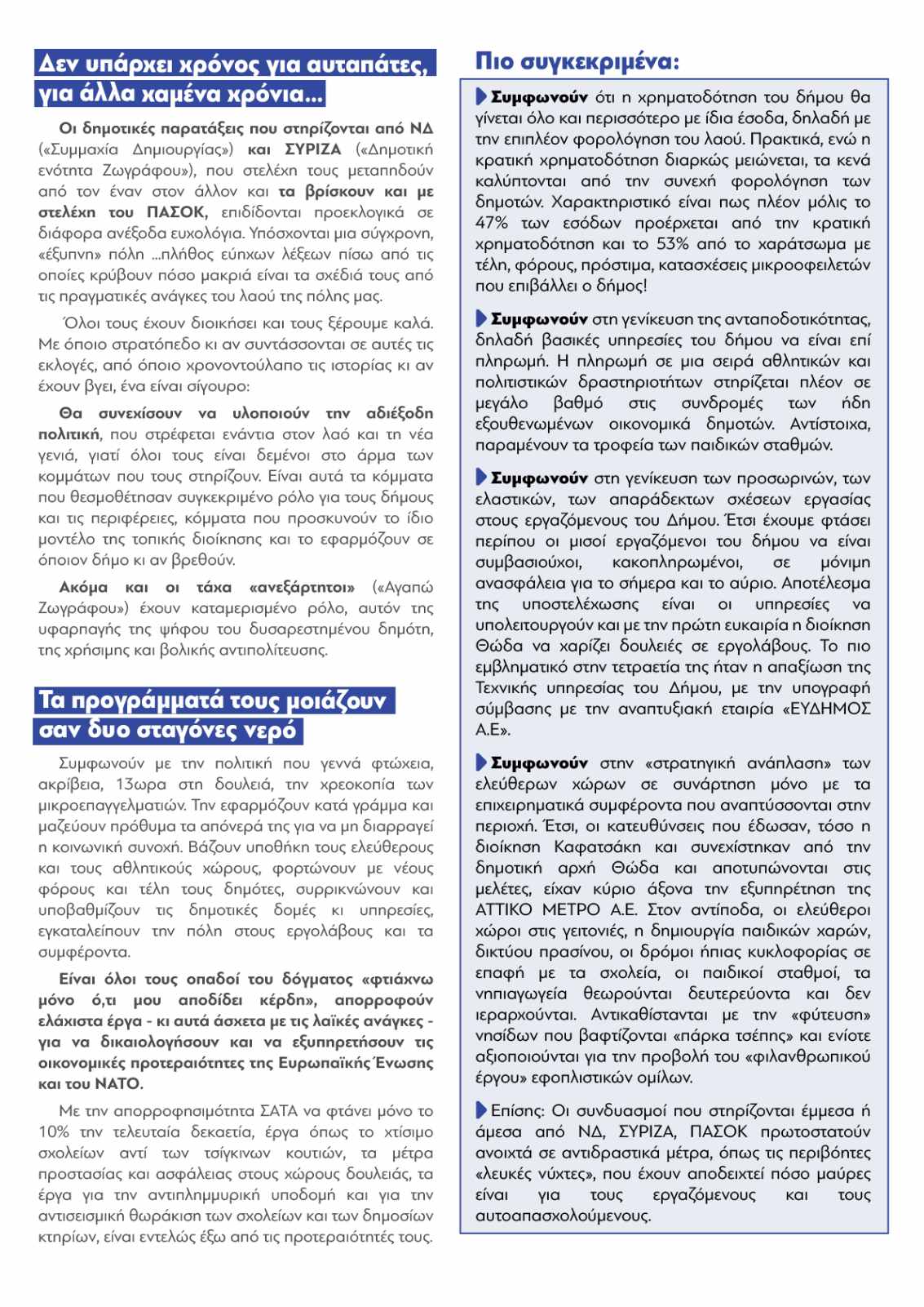 Ακόμα και οι τάχα «ανεξάρτητοι» («Αγαπώ Ζωγράφου») έχουν καταμερισμένο ρόλο, αυτόν της υφαρπαγής της ψήφου του δυσαρεστημένου δημότη, της χρήσιμης και βολικής αντιπολίτευσης.