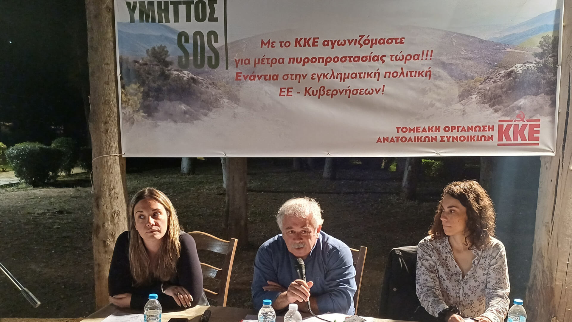 Για την προετοιμασία αντιμετώπισης των δασικών πυρκαγιών, τόνισε ότι τα μόνα μέτρα που έχει λάβει η κυβέρνηση δεν έχουν σκοπό την ουσιαστική αντιμετώπιση των πυρκαγιών. Μέσα σε αυτά «φέτος η κυβέρνηση της ΝΔ βιάζεται να παραδώσει τη διαχείριση και την εκμετάλλευση των δασών στους ξυλοβιομήχανους και τους ξυλέμπορους, με κρατική μάλιστα επιδότηση, ικανοποιώντας ένα πάγιο αίτημα των ξυλοβιομηχανιών από τη δεκαετία του 2000. Αυτό προβλέπει μεταξύ άλλων, ο νόμος που ψήφισε πρόσφατα στη βουλή. Το μόνο που επιδιώκουν είναι η αύξηση και της δασικής βιομάζας για παραγωγή ενέργειας, με στόχο το 2050 να είναι η βιομάζα, τρίτη στην κατάταξη του ενεργειακού μείγματος στη βιομηχανία. Η εκχώρηση αυτή γίνεται στο όνομα της “πράσινης μετάβασης”. Της επιδίωξης της ΕΕ, για «κλιματική ουδετερότητα» απέναντι στη λεγόμενη κλιματική κρίση. Εντείνει την εκμετάλλευση των δασών, οδηγεί στην πλήρη εμπορευματοποίησή και την καταστροφή τους για το κέρδος. Στη δημιουργία αγοράς δικαιωμάτων εκπομπών ρύπων. Μάλιστα στις πρώτες διαχειριστικές μελέτες που ανατίθενται συμπεριλαμβάνεται και ο Υμηττός. Ο νόμος αυτός, δεν πρόκειται ούτε μπορεί να αντιμετωπίσει τον κίνδυνο εκδήλωσης δασικών πυρκαγιών, ούτε εξασφαλίζει την διαχείριση και προστασία των δασών από τις δασικές πυρκαγιές και κάθε άλλο κίνδυνο» υπογράμμισε, ενώ ανέδειξε ότι με την Κοινή Υπουργική Απόφαση για την εφαρμογή του απαράδεκτου κανονισμού πυροπροστασίας ακινήτων, μέσα και κοντά σε δάση και δασικές εκτάσεις, η κυβέρνηση για άλλη μια φορά προσπαθεί να «βγάλει από πάνω της» την πολιτική ευθύνη για πιθανές νέες καταστροφές και να τη φορτώσει στα λαϊκά νοικοκυριά με προσθετά χαράτσια – πρόστιμο και νέα βάρη. Αφού θα πρέπει να πληρώσουν για την προβλεπόμενη τεχνική έκθεση πυροπροστασίας τουλάχιστον 500 ευρώ. Ενώ επιπλέον, φορτώνει και την υποστελεχωμένη από τεχνικό και επιστημονικό προσωπικό τοπική διοίκηση, με πρόσθετο διοικητικό βάρος με το τυράκι της είσπραξης των προστίμων. Και αυτός ο κανονισμός αυτός αποτελεί μέρος της εξειδίκευσης στην Ελλάδα της πράσινης μετάβασης της ΕΕ και της Ευρωπαϊκής συμφωνίας, που αποτελεί την κοινή πολιτική όλων των κυβερνήσεων και της σημερινής. Γιατί είναι κι αυτός ενταγμένος, εκτός των άλλων, και στην προσπάθεια να αυξηθεί η δασική βιομάζα για παραγωγή ενέργειας με κάθε τρόπο, ως πρώτη ύλη για ενέργεια.